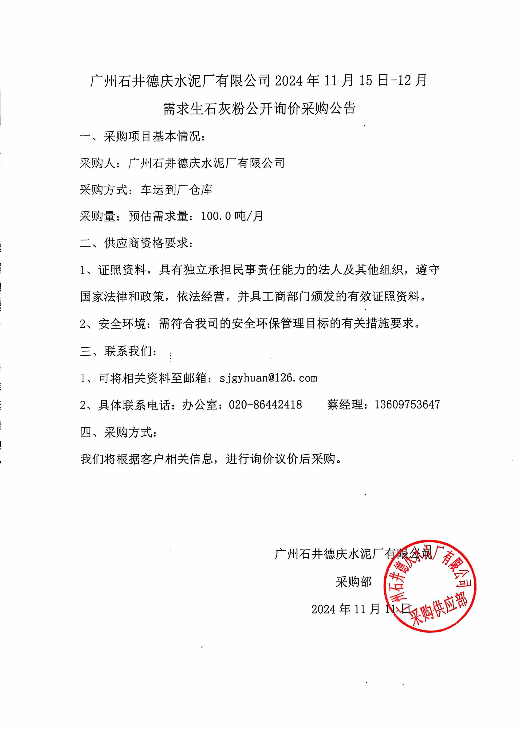 广州石井德庆水泥厂有限公司2024年11月15日-12月需求生石灰粉公开询价采购公告