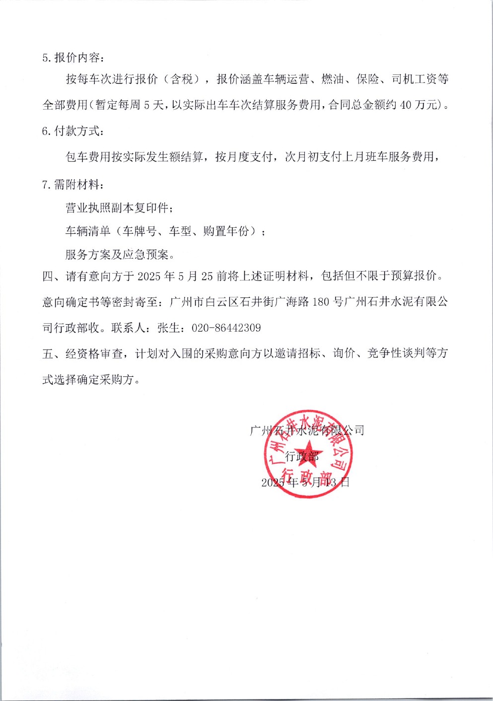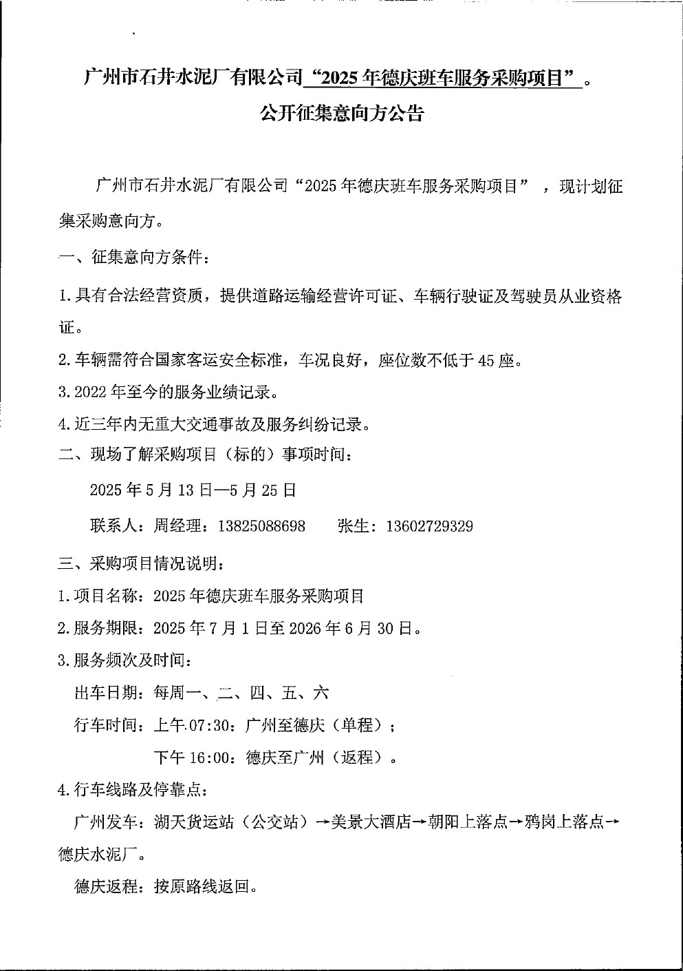 广州市石井水泥厂有限公司2025年德庆班车服务采购项目招标征集意向方公告